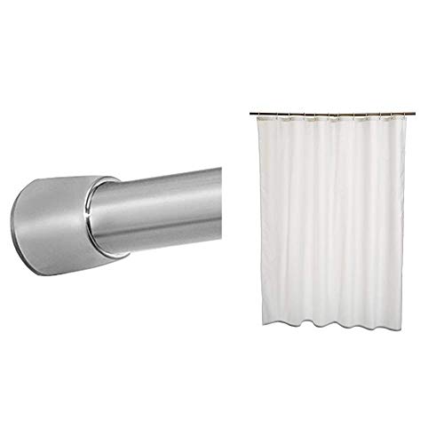 InterDesign iDesign Tringle Extensible pour Rideau de Douche, Petite Barre de Douche en Acier Inoxydable, argenté Mat & Amazon Basics Rideau de Douche en Polyester 180 x 200 cm Blanc