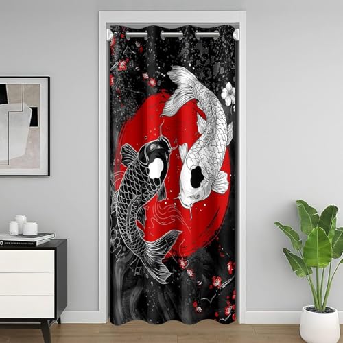 Homemissing Japonais Koi Poisson Rideau de Porte 106x203cm 1 Panneau, Fleurs de cerisiers Rideau Thermique Soleil Rouge Japonais Wave Occultant Rideaux Japonais Ukiyoe Rideaux Interieur