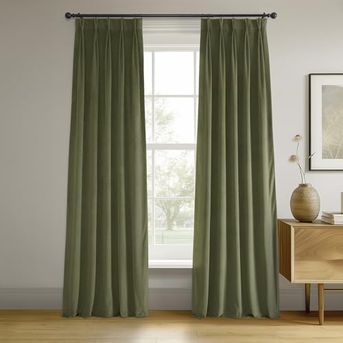 Joydeco Rideau Velours Vert Olive avec Galon Fronceur 132x245 CM 2 Pièces pour Rail et Passe Tringle, Rideau Occultant Thermique Anti Froid avec Revêtement 100% Anti-Lumineux, Épais Lourd 330g/m²