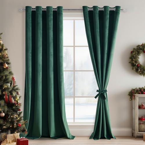 DWCN Rideau Velours 140L X 280H cm Lot de 2, Semi-Occultant Thermiques Rideau à Oeillets avec 2 Embrasses, Moderne Doux Luxurious Rideaux Velours pour Chambre, Salon, Bureau, Hôtel, Vert Foncé