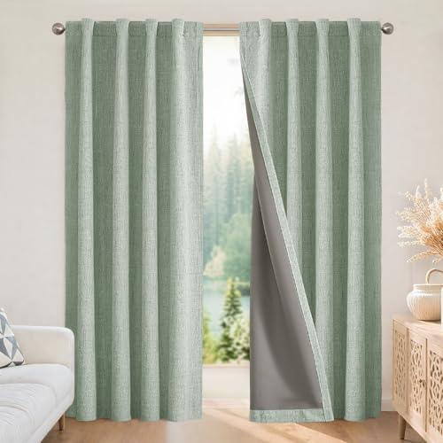 Joydeco 100% Rideau Occultant Vert Sauge 140x220 cm 2 Pièces, Rideaux en Lin Isolant Thermique Anti UV à Pattes Cachées et à Passe Tringle pour Décoration Chambre Salon et Protection d'Ameublement
