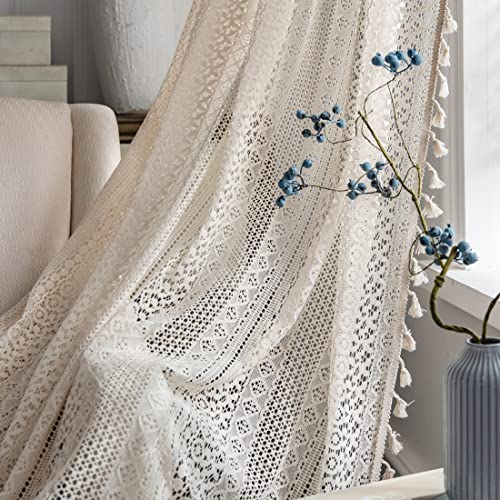 Sutuo Home Rideaux bohèmes Semi-Transparents en Dentelle au Crochet avec Pampilles tricotées à la Main avec Passe-Tringle, Rideaux de fenêtre Vintage et rustiques pour Salon, Chambre à Coucher, 1