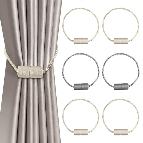 Lot de 6 embrasses de Rideau magnétiques, Retenues de Draperie, Magnétiques Embrasses de Rideaux pour Rideau décoratif, Boucle de Rideau Aimanté Attache Rideau Corde (4 Beiges et 2 Grises)