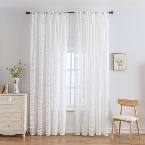 L.Z.E Rideaux Voilage Blanc Transparent Boho pour Salon Chambre des Filles Blanc Cassé 245 cm Long et Tentures Rideau Voilage à Œillets pour Salle à Manger de Fenêtre Motif Grométrique Tridimensionnel