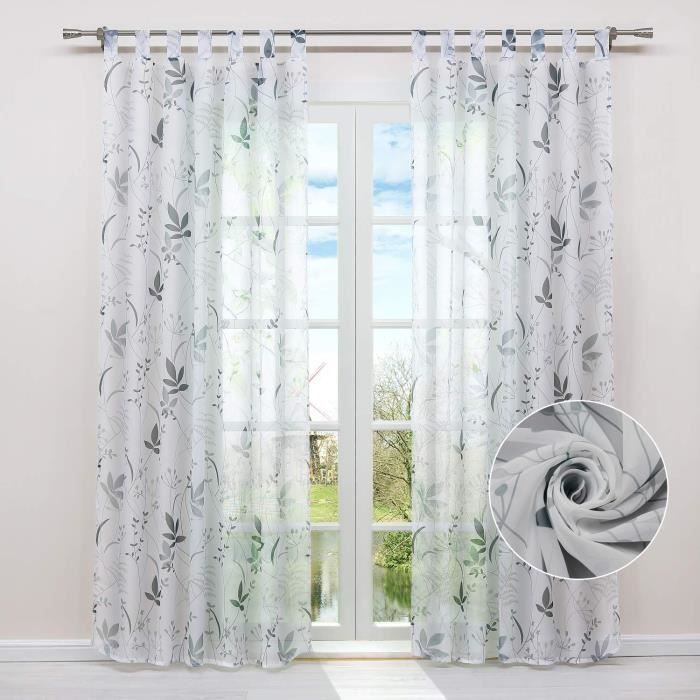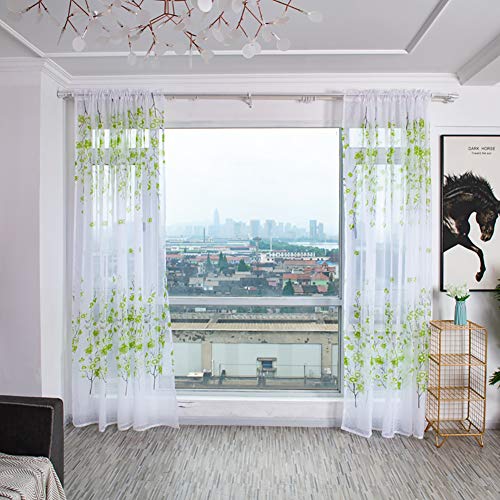 Boyouth Rideaux en voile blanc transparent avec motif fleurs de pêcher vertes - Poches à tringle - Pour chambre à coucher, bureau, salon, 100 x 200 cm - 2 panneaux