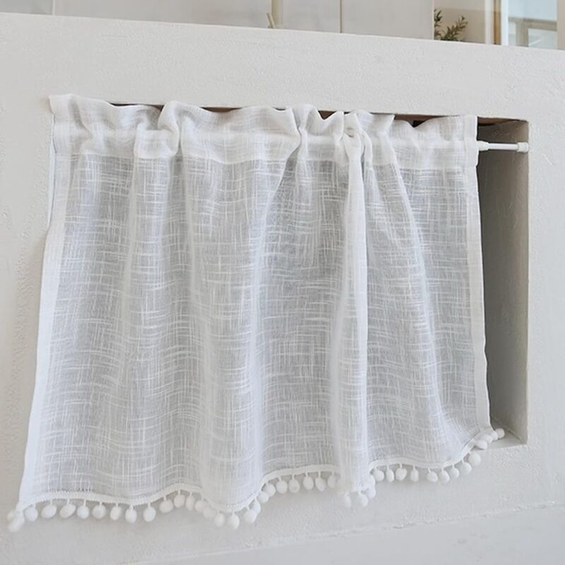 Rideau de Cuisine Court pour Petit Fenêtre Lin Coton Texture Transparent Blanc Uni avec Pompon Rideau Brise-bise Rideaux à Disques Panneaux