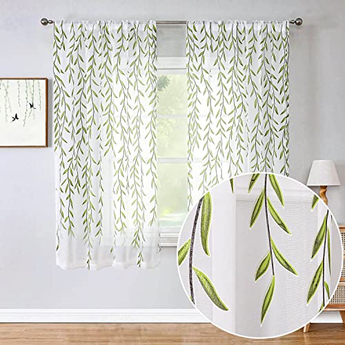Lot de 2 rideaux courts blancs transparents de 160 cm - Motif feuilles sur fenêtre - Rideaux transparents mignons - Motif vigne verte - Pour sous-sol, cuisine, salle de bain, chambre à coucher - Avec passe-tringle