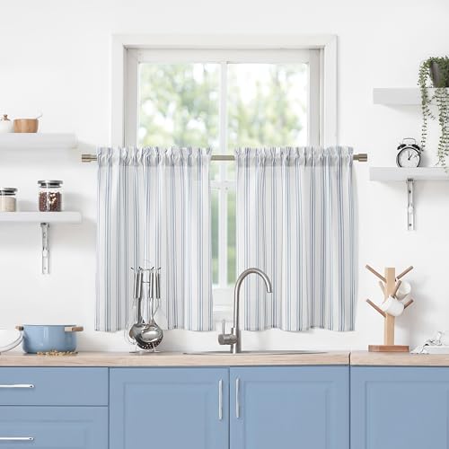 ZJDECOR Lot de 2 Rideaux Blancs en Coton mélangé avec Rayures Bleues, filtrant la lumière pour fenêtres de Cuisine, Salle de Bain, Camping-Car, Passe-Tringle, 71 x 91,4 cm (l x L), Bleu/Blanc