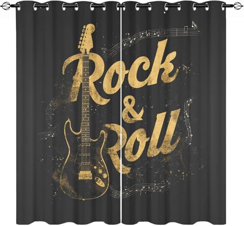 Générique Lot de 2 Opaque Rideaux Occultants 140L X 225H cm (2 Panneaux) ThèMe Rock Guitare DoréE Rideaux Thermique À Oeillets, Noir Doux et Infroissable Draperies pour Salon Chambre Fenetre
