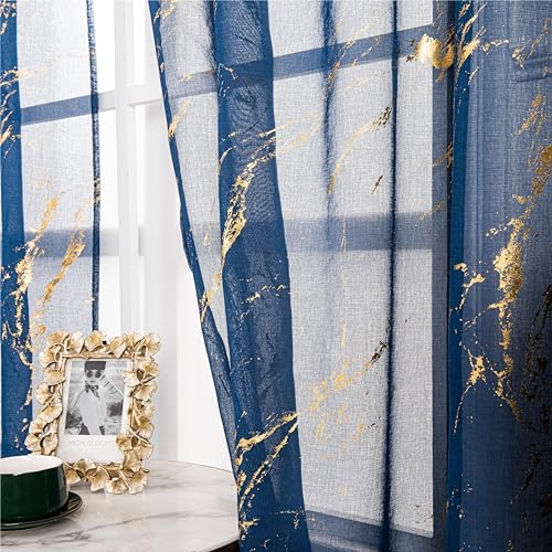 Lavyhuno Lot de 2 Rideaux Transparents de 213,4 cm de Long avec Passe-Tringle pour Salon, Rideaux de Traitement de fenêtre à imprimé en Feuille dorée métallisée, 132,1 x 213,4 cm (l x L), marbre Bleu