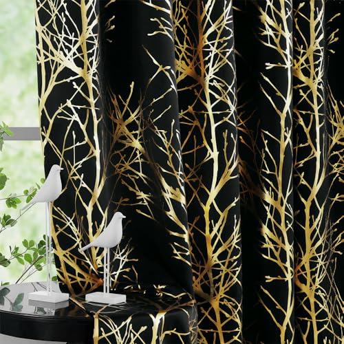 Fmfunctex - Rideaux opaques de couleur noire et dorée pour salon, rideaux avec œillets pour chambre, branches d'arbre, panneaux de rideau de fenêtre avec isolation thermique pour chambre d'enfant, 2