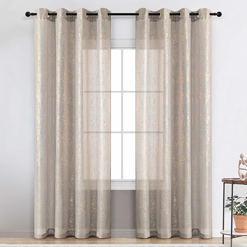 TERLYTEX Lot de 2 Panneaux de Rideaux Transparents Gris et dorés pour Salon, voilages Gris à Pois en Feuille dorée métallisée de 213,4 cm de Long, Rideaux de fenêtre Transparents à œillets, 132,1 x
