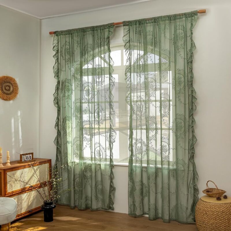 Aligogo Lot de 2 Rideaux Transparents en Dentelle Florale à Bord festonné, Style Rustique pour fenêtre de Salon, garantit l’intimité, 132,1 x 243,8 cm (l x L), Vert Sauge
