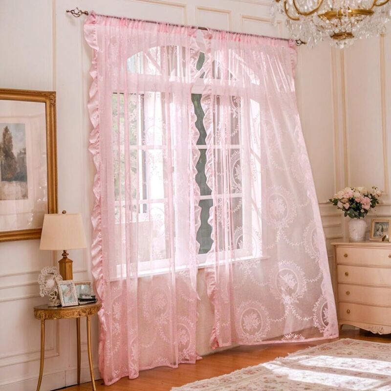ALIGOGO Lot de 2 Rideaux Roses pour Chambre de Fille, Chambre d'enfant, 160 cm de Long, Rideaux élégants en Dentelle Florale Transparente avec Passe-Tringle, pour Salon, Salle de Bain, décoration de