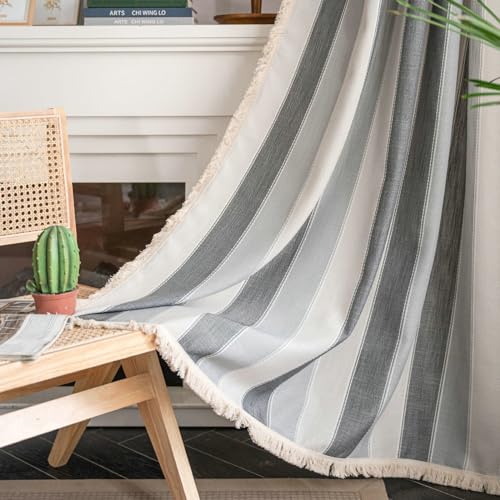 Daesar Rideau Moderne Salon Semi Transparent Gris 132x200CM, Lot de 2 Rideaux Fenêtre Chambre à Crochets Rayures avec Glands Beige Coton Fenêtre Rideaux Cuisine Balcon Baie Vitrée