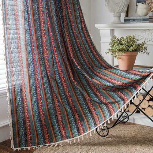 Daesar Rideaux Semi Opaque Chambre Bleu Rouge 150x180CM, Lot de 2 Rideaux Salon Moderne à Oeillets Ethnique Rayures avec Glands Coton Lin Fenêtre Rideaux Cuisine Balcon Baie Vitrée