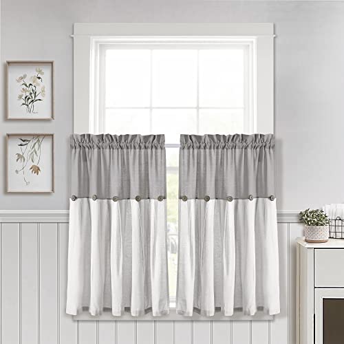 Lush Decor Ensemble de Rideaux de fenêtre de Cuisine à Boutons en Lin, 73,7 cm de Long x 91,4 cm de Large, Gris et Blanc