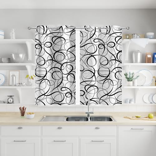 tubeamin Lot de 2 Rideaux Courts pour Cuisine, Salle de Bain, Chambre à Coucher, 66 x 91,4 cm, Motif géométrique Moderne, occultant, bloquant la Chaleur, Noir et Blanc