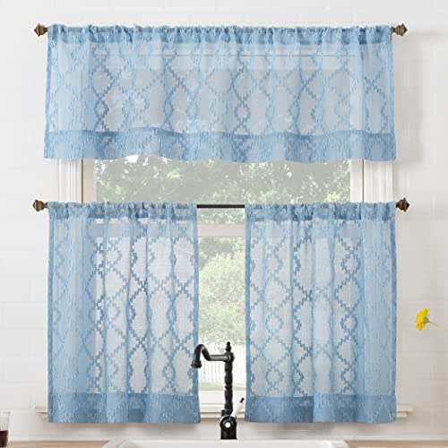 No. 918 Tina Ensemble de cantonnières et de Rideaux de Cuisine Semi-Transparents à Motifs géométriques avec Passe-Tringle, 137,2 x 61 cm, Bleu Tranquille