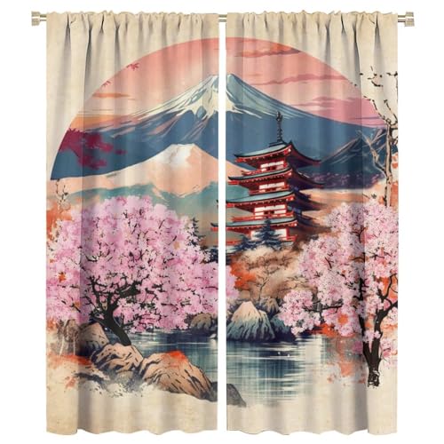SDOTPMT 66X160cm Rideau de fenêtre Japonais Peinture à l'encre MT. Fuji Soleil Rouge Coucher de Soleil Fleurs de Cerisier Grandes Vagues Rideaux de fenêtre pour Chambre à Coucher, 2 Panneaux