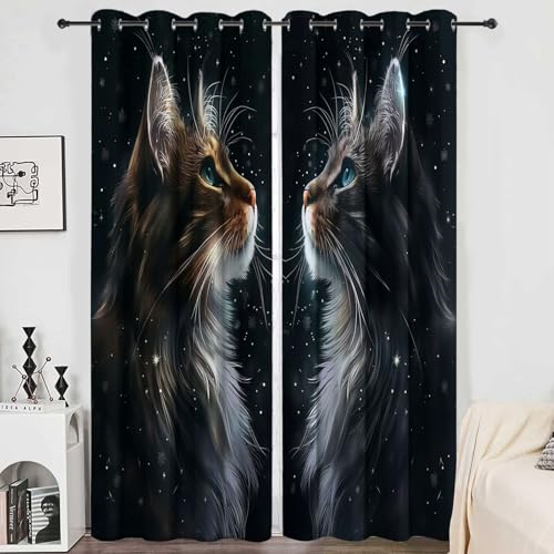 Rideaux Occultants Chat Tigré À Poil Long Thermiques à Oeillets - 2 Pièces, Isolants Anti Froid et Chaleur, Anti-UV, Chat Du Ciel Étoilé 234 x 230cm - Pour Porte, Salon, Chambre, Cuisine, Dressing