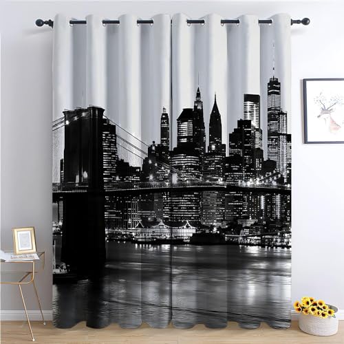 Rideaux Occultants Thermiques à Oeillets Horizon de New York et Pont de Brooklyn - Isolants Anti Froid et Chaleur, Anti-UV, 220 x 215cm Paysage Urbain - pour Porte, Chambre, Cuisine, Dressing