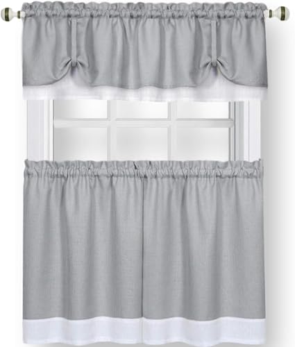 Achim Home Decor Darcy Ensemble de rideaux de fenêtre à niveau et cantonnière – 147 cm de large et 91 cm de long – Rideaux filtrant la lumière pour cuisine, chambre, salon et salle à manger (gris/blanc)