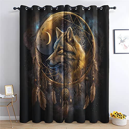 Rideau Occultant Attrape Rêve Loup - Lot de 2 Rideaux Thermiques Isolants Anti Froid Imprimé pour Salon Chambre Fenetre Cuisine, Rideaux et Draperies Intérieurs à Oeillets, 110x215 cm (LxH)