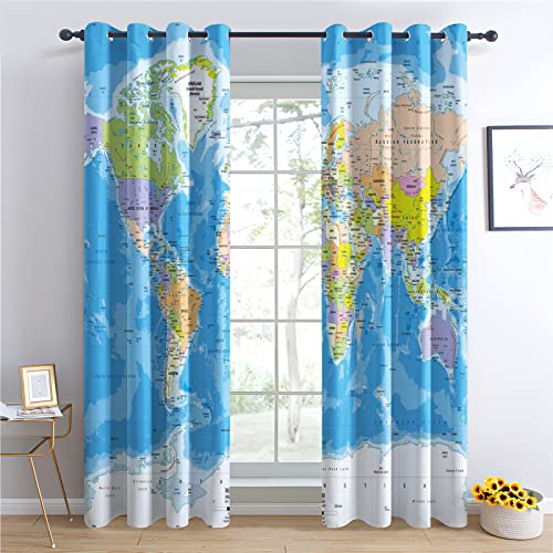 Rideau Occultant Carte du Monde - Lot de 2 Rideaux Thermiques Isolants Anti Froid Imprimé pour Salon Chambre Fenetre Cuisine, Rideaux et Draperies Intérieurs à Oeillets, 140x260 cm (LxH)