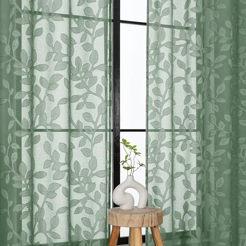 OVZME Lot de 2 Rideaux Transparents Vert Sauge de 213,4 cm de Long pour Salon, Rideaux de fenêtre Semi-Transparents texturés à Motif de Feuilles Jacquard, filtrant la lumière, pour Chambre à Coucher,