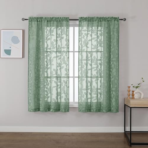 OVZME Lot de 2 panneaux de rideaux transparents vert sauge de 137,2 cm de long pour salon, rideaux de fenêtre semi-transparents texturés à motif de feuilles jacquard, filtrant la lumière, pour chambre