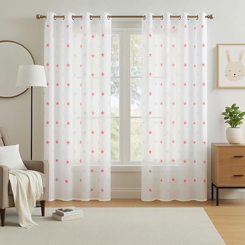 Deconovo Lot de 2 Rideaux Brodé Voilage Gris Étoile à Oeillets Rideaux Voilages Chambre 140x260 CM Blanc et Orange