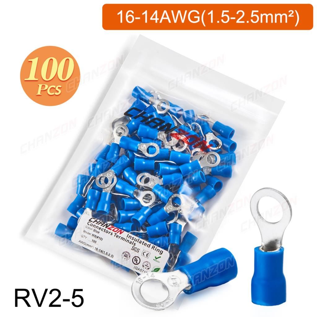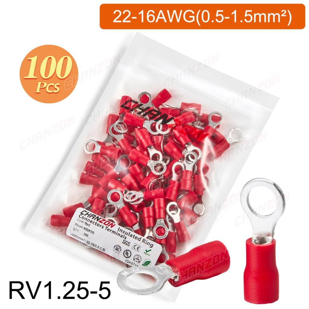 Outil de sertissage d'anneau électrique,connecteurs de fil de sertissage,câblage isolé politiquement,rouge,bleu,jaune,Rmusic25,Rv2,Rv5,22-10AWG,50 pièces,100 pièces - Type 100PCS RV1.25-5