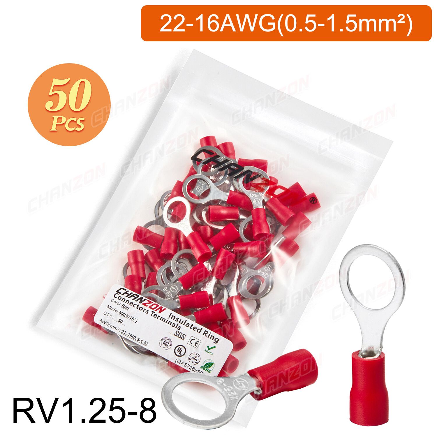 Outil de sertissage d'anneau électrique,connecteurs de fil de sertissage,câblage isolé politiquement,rouge,bleu,jaune,Rmusic25,Rv2,Rv5,22-10AWG,50 pièces,100 pièces - Type 50PCS RV1.25-8