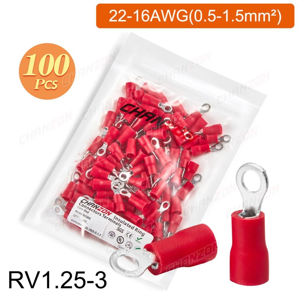 Outil de sertissage d'anneau électrique,connecteurs de fil de sertissage,câblage isolé politiquement,rouge,bleu,jaune,Rmusic25,Rv2,Rv5,22-10AWG,50 pièces,100 pièces - Type 100PCS RV1.25-3