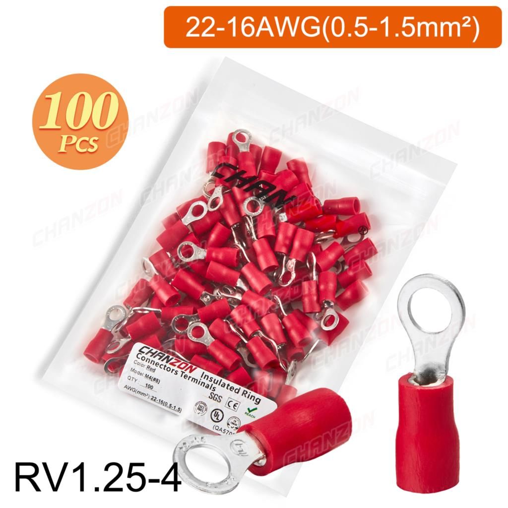 Outil de sertissage d'anneau électrique,connecteurs de fil de sertissage,câblage isolé politiquement,rouge,bleu,jaune,Rmusic25,Rv2,Rv5,22-10AWG,50 pièces,100 pièces - Type 100PCS RV1.25-4