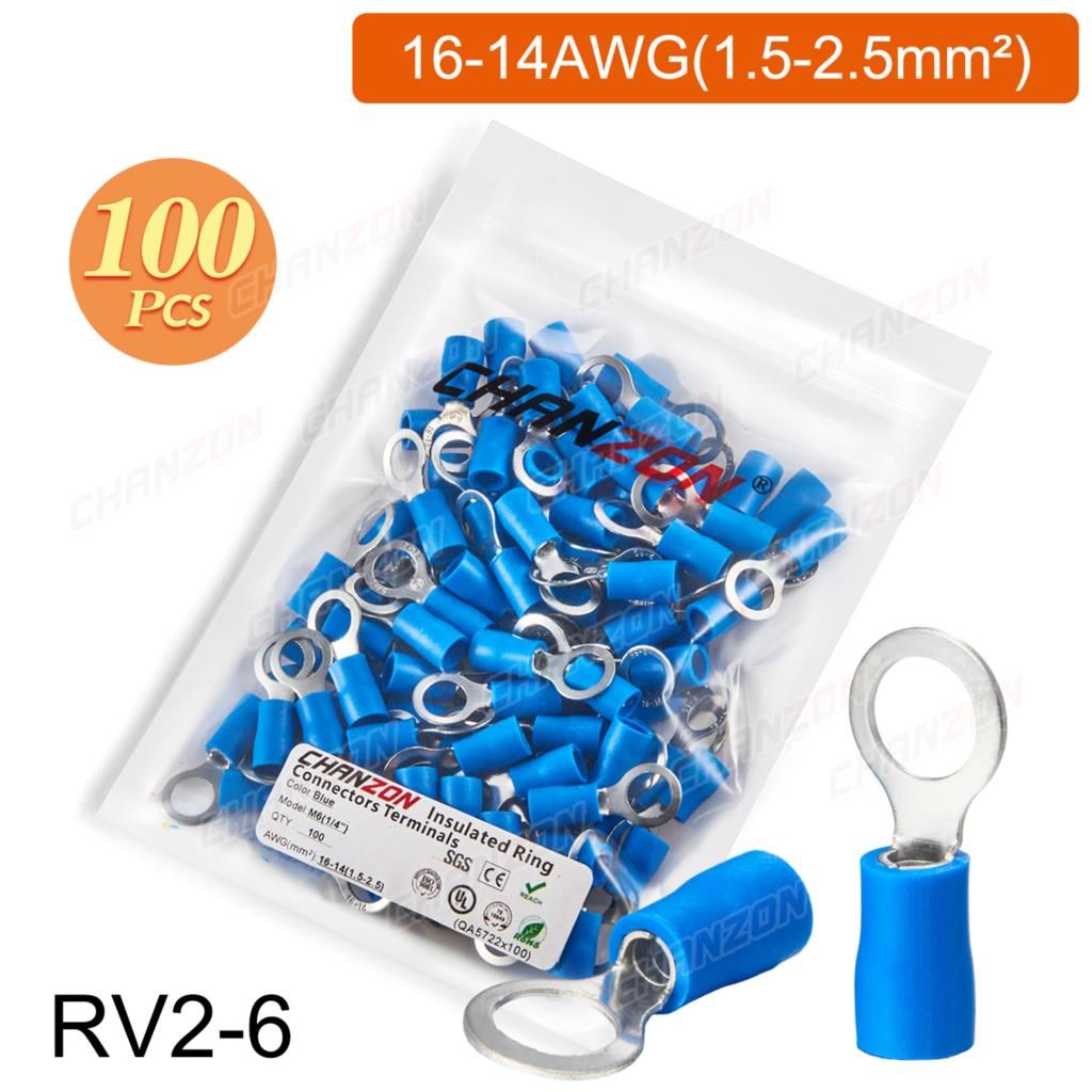 Outil de sertissage d'anneau électrique,connecteurs de fil de sertissage,câblage isolé politiquement,rouge,bleu,jaune,Rmusic25,Rv2,Rv5,22-10AWG,50 pièces,100 pièces - Type 100PCS RV2-6