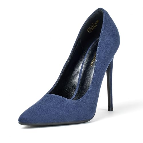 GENSHUO Escarpins 12CM pour Femmes, Bout Fermé, Talons Aiguilles, Chaussures à Enfiler Sexy à Talons Hauts, Chaussures de Robe de Soirée de Mariage, Daim Bleu Marine, 41 EU