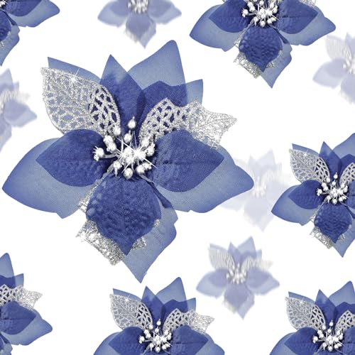 BOAO Lot de 24 Fleurs de Poinsettia artificielles à Paillettes pour Mariage, Sapin de Noël, Nouvel an (Bleu Marine)