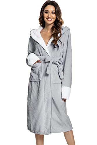Tuopuda Peignoir de Bain Femme Polaire à Capuche Robe de Chambre Sortie de Bain à Capuche Pyjama Hiver Chaude Peignoirs avec Ceinture Poches Nuisette Vêtements de Nuit pour Fête Mariage, gris clair