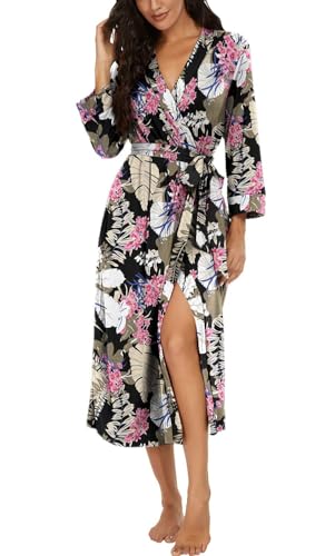 PrinStory Robe de Chambre Femme Longue - Robes Kimono en Maille Gaufrée - Peignoir Doux pour Femme - Vêtement de Détente Décontracté pour Dames, Noir , L