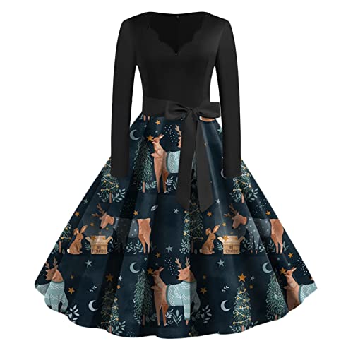 Robe De Noel Femme Manches Longues, Robe Cocktail Femme Imprime Noël Col V Trapeze Midi Casual Sexy Costume De Soiree Automne Bal Rockabilly Christmas Moche Fete
