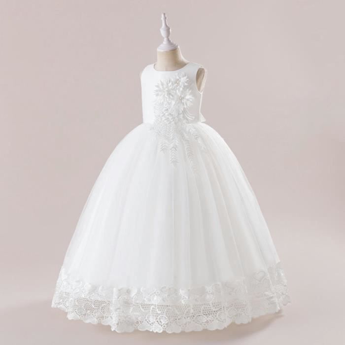 Robe De Princesse Mariage Fille Sans Manches Robe Ceremonie Longue Tulle Avec Ceinture Noeud Papillon - Blanc