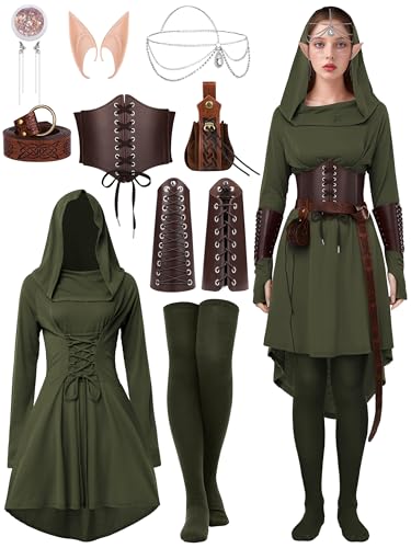 SOMSOC Costume de fée médiéval à capuche pour femme - Robe à lacets - Accessoires de costumade, vert foncé, X-Large