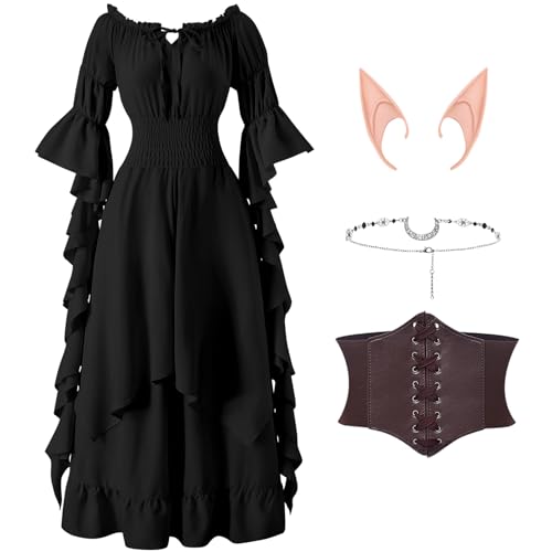 LumenVela Robe Medievale Femme, Robe Renaissance Femme avec Corset, Oreilles D'elfe, Coiffe, sans Bretelles Manches Bouffantes Deguisement Halloween Gothique pour Carnaval Halloween Fête (Noir, M)