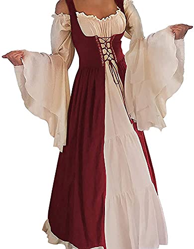 WEITING Robe Médiévale Femmes Manches Longues Maxi Robe Vintage Fée Elfe Robe Renaissance Celtique Viking Gothique Vêtements Fantasy Ball -Vin Rouge,XXXL
