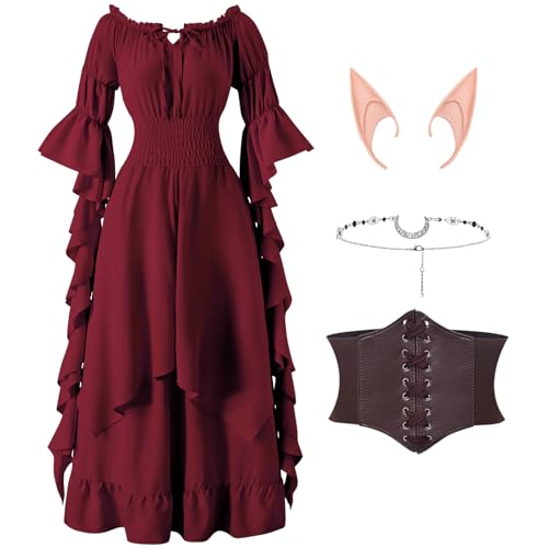 WEITING Robe Médiévale Femmes Manches Longues Maxi Robe Vintage Fée Elfe Robe Renaissance Celtique Viking Gothique Vêtements Fantasy Ball -Vin Rouge,4XL