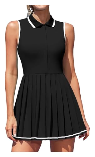 JTKSSCS Robe Tennis Femme Robe De Tennis for Femmes, Polo, Demi-Fermeture Éclair, Plissée, avec Soutien-Gorge Intégré, Short Séparé, Une Pièce, Coupe Cintrée avec Poches, Robe De Golf(Black,S)