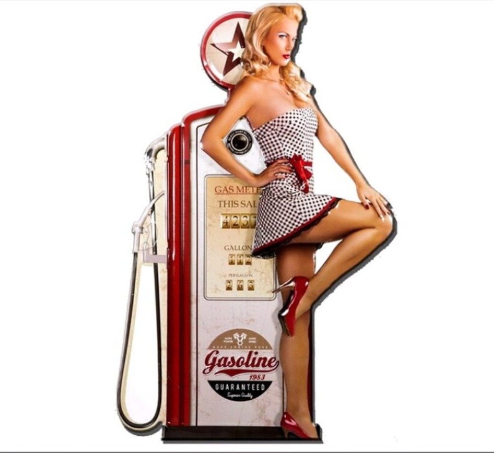 Plaque 70x45cm Pin Up Robe Vichy Pompe A Essence Tole Emboutie