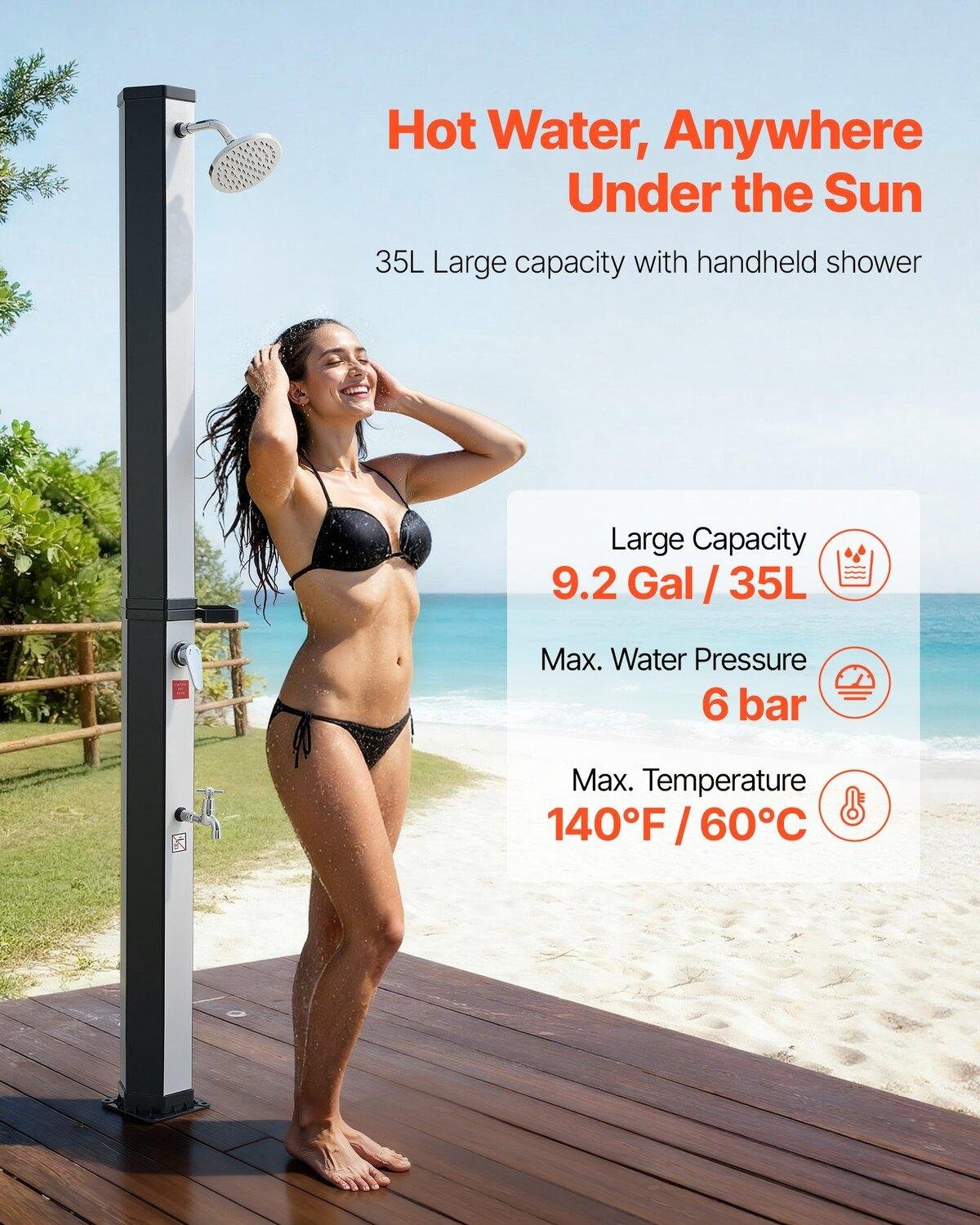 Douche Solaire 35L - Douche de Jardin Solaire Chaude avec Robinet et Pommeau de Douche à Effet Pluie, Température Réglable Jusqu'à 60°C, Douche Solaire Exterieure Idéal pour Piscine Plage Jardin